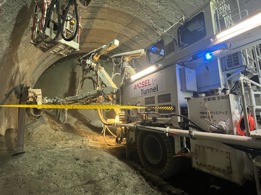 トンネルを2本並べた併設トンネルの後行(左側)トンネル(幅約11m、高さ約10m)の掘削に着手しました。