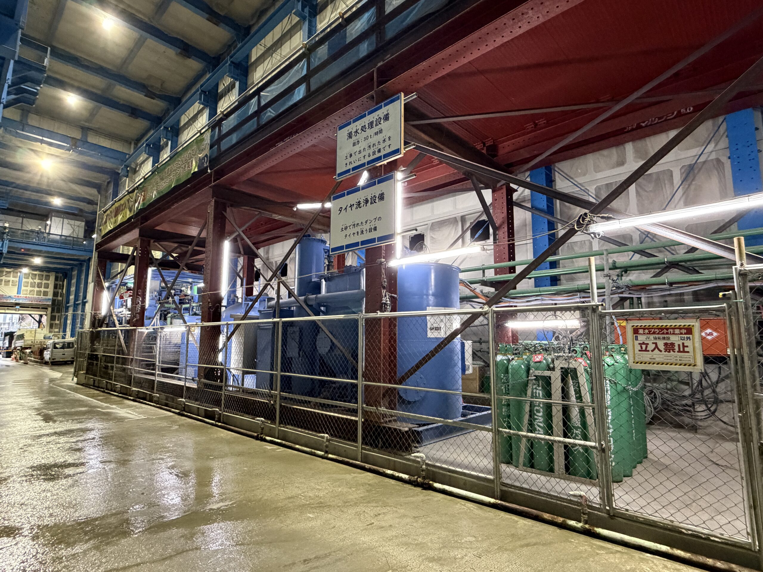 防音ハウス内には、工事で発生する土砂などが混ざった水をきれいにするため、泥を沈殿させる水槽、沈殿した泥をこし取る機械やpH処理をする濁水処理設備を設けています。現場内での再利用による水資源への負担軽減や生活排水路に流せるレベルまできれいにすることで、環境への影響を抑えています。